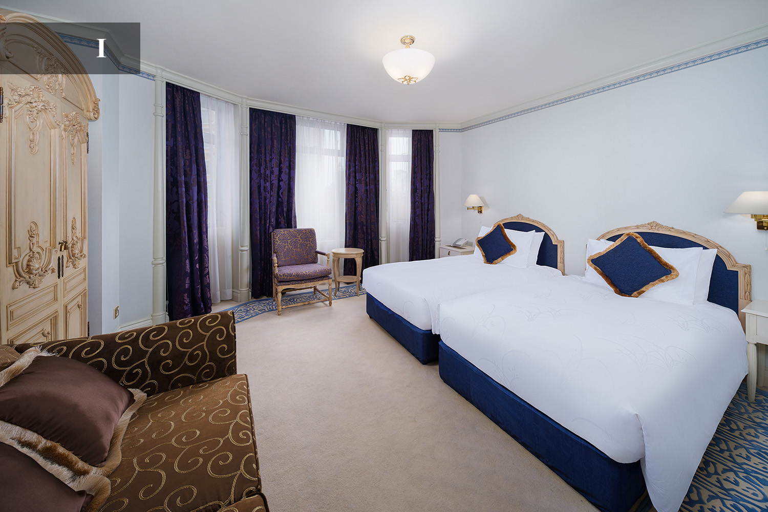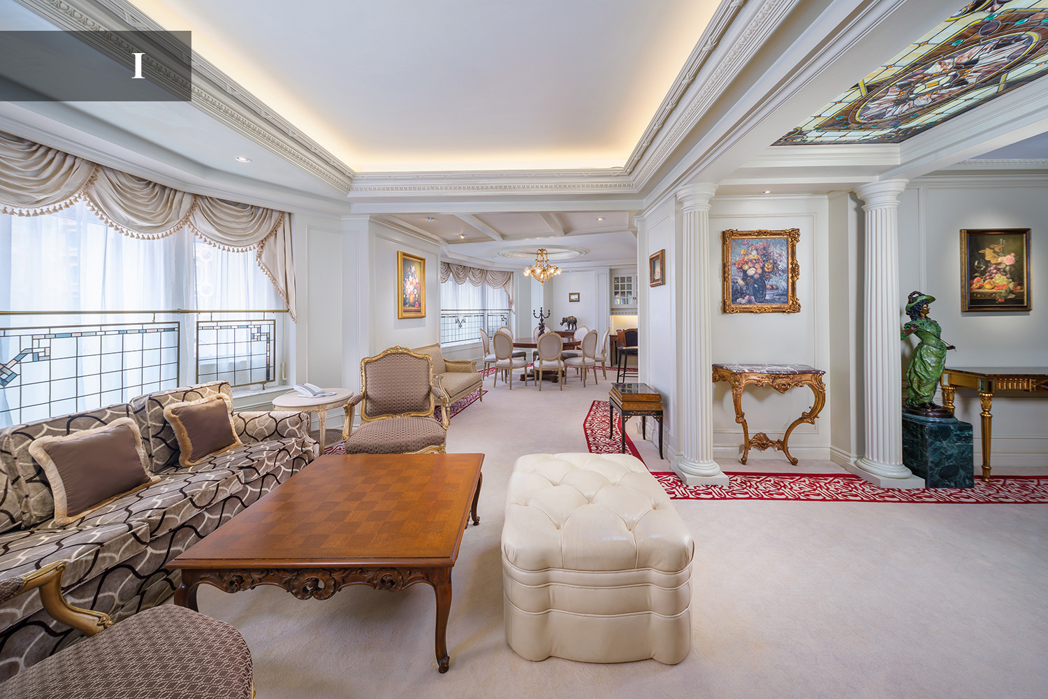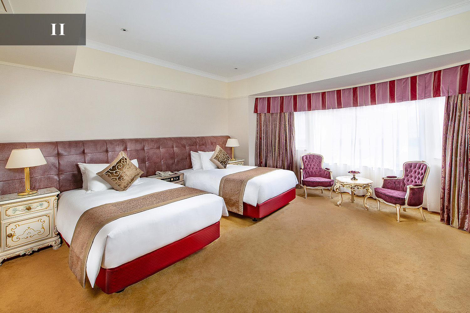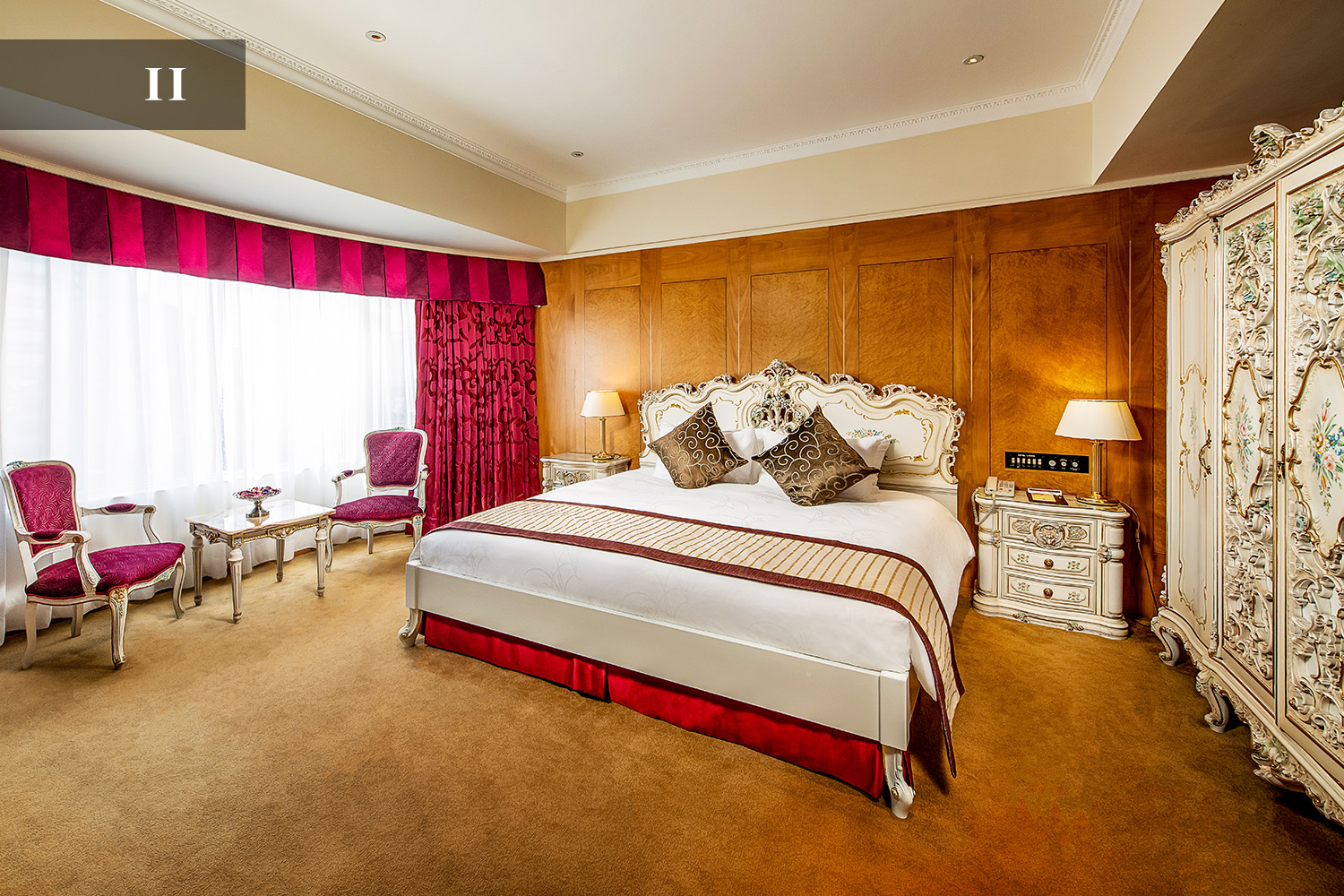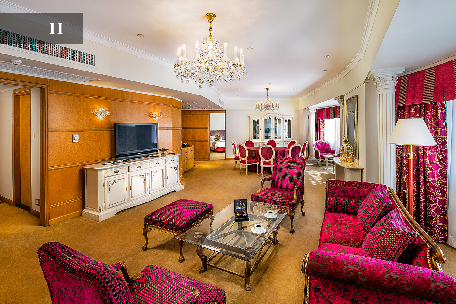 踏进尊豪套房(大、双床房各一及备有客厅),装饰艺术甚浓的古典陈设,让宾客体验欧陆情怀。现代化独特的浴室设计,其马赛克图案地砖、晶莹透彻的玻璃器皿及大理石墙壁。宾客更可免费享用房内中外电影、WIFI、本地电话及迷你吧赠饮。