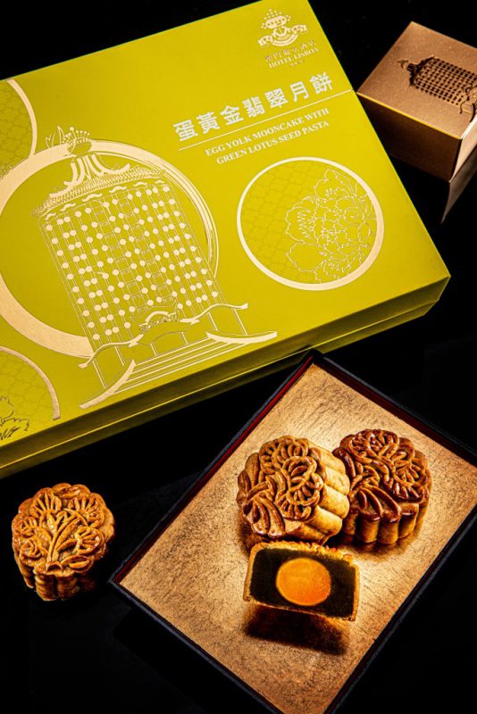 蛋黃金翡翠月餅 – 以味美清香的班蘭葉融合幼滑的蓮蓉,再配上優質的蛋黃製成;口感獨特清香而細膩,滋味無窮。