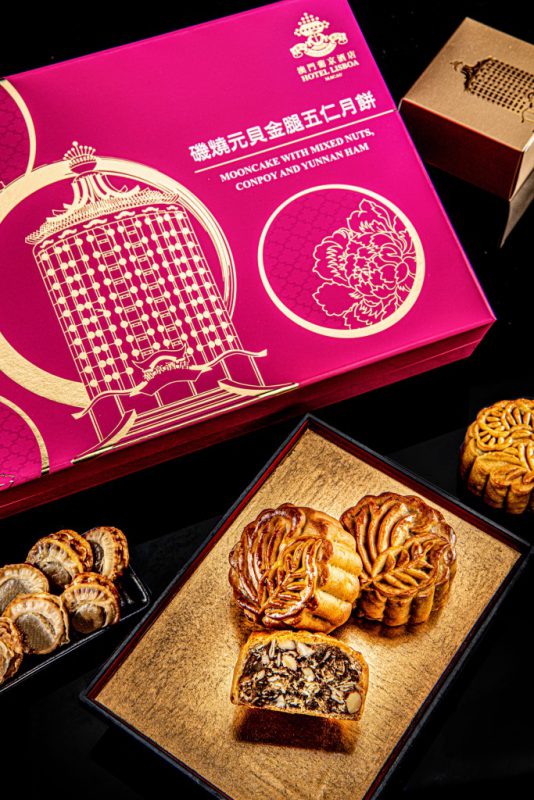 磯燒元貝金腿五仁月餅 – 以上乘的磯燒元貝作主要餡料,混合健康的果仁及頂級金腿,造出不同層次的口感,令人一試難忘。